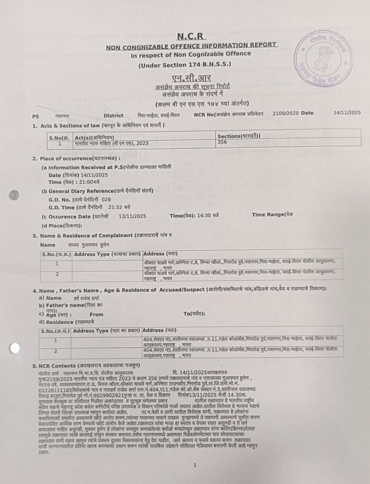 भारतीय जनता पार्टी के विधि प्रकोष्ठ के उपाध्यक्ष हर्ष राजेश शर्मा के खिलाफ सोशल मीडिया पर एक वीडियो के माध्यम से कांग्रेस के वरिष्ठ नेता मुजफ्फर हुसैन पर जानबूझकर झूठे और निराधार आरोप लगाकर उन्हें बदनाम करने के आरोप में नया नगर पुलिस स्टेशन में भारतीय दंड संहिता के तहत मामला दर्ज किया गया है। कांग्रेस के मुख्य प्रवक्ता प्रकाश नागने ने बताया कि आगामी नगर निगम चुनावों के मद्देनजर मुजफ्फर हुसैन की छवि खराब करने के उद्देश्य से निराधार, बेबुनियाद और झूठे आरोप लगाने के आरोप में नया नगर पुलिस स्टेशन में मामला दर्ज किया गया है।