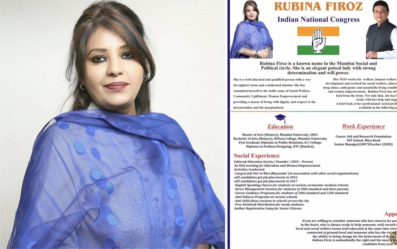 रुबीना फिरोज शेख ने समाज कल्याण के लिए काम करने के दृढ़ संकल्प के साथ 2016 में भारतीय राष्ट्रीय कांग्रेस में शामिल हुईं। उनकी निष्ठा, ईमानदारी और जनता के साथ गहरे जुड़ाव के कारण 2017 में उन्हें पार्षद चुना गया, और तब से वह इस जिम्मेदारी को पूरी निष्ठा और निष्ठा के साथ निभा रही हैं।